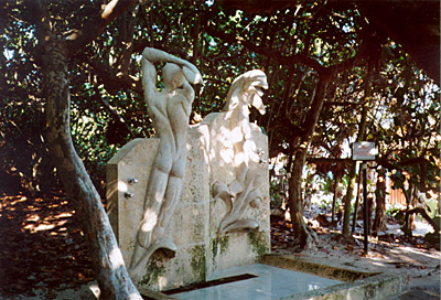 Torso and two dolphins shower between the beach and the pool.